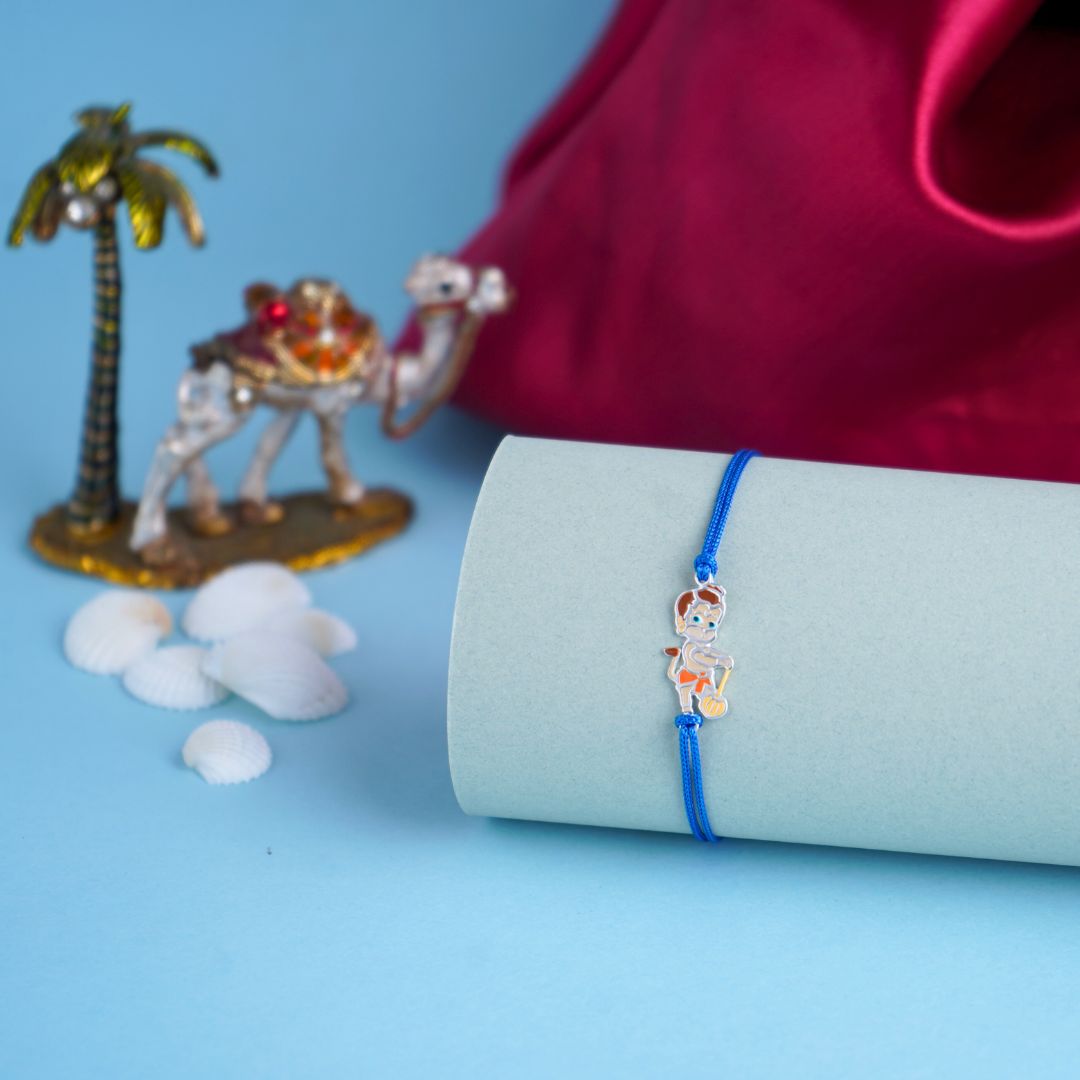 A silver rakhi is a traditional Indian bracelet tied around the wrist as a symbol of protection and love, typically during the festival of Raksha Bandhan. It features an elegant, intricate design crafted from sterling silver, often embellished with delicate patterns, filigree work, or small gemstones. The centerpiece may include auspicious symbols such as Om, Swastika, or a simple floral design, adding to its cultural significance. The rakhi is usually tied with a colorful, soft thread, enhancing its aesthetic appeal and making it a cherished keepsake.