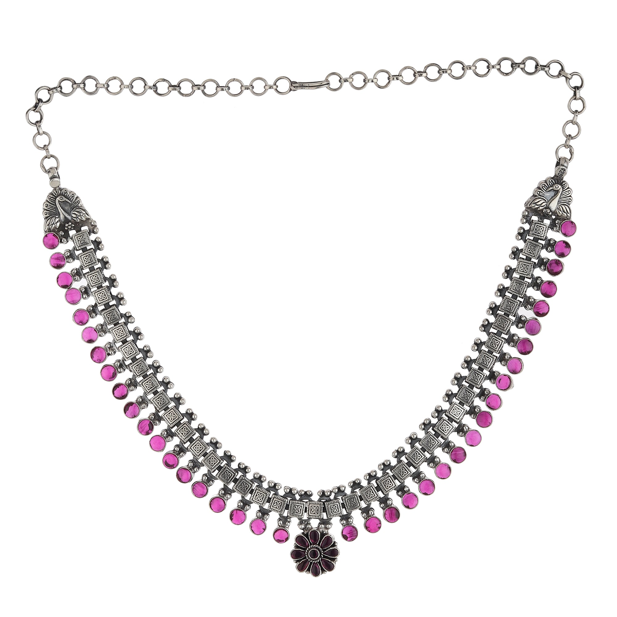 This peacock oxidized sterling silver necklace is a stunning piece of jewelry that features a unique and intricate design. The necklace is made from high-quality sterling silver that has been oxidized to give it a dark, antique finish. The centerpiece of the necklace is a beautiful peacock design that is adorned with sparkling gems or crystals, which add an extra touch of elegance to the piece. The necklace is the perfect accessory to complement a variety of different outfits and is sure to make a bold statement whenever it is worn.